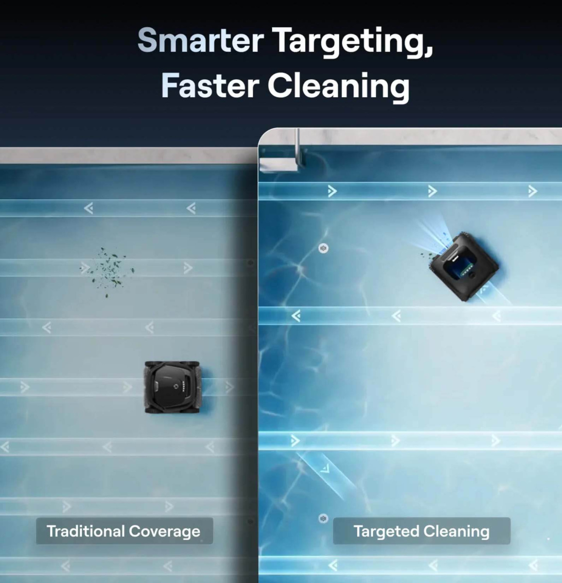 Завдяки інтелектуальному плануванню маршруту робот виконує очищення швидше, точніше та економніше порівняно з моделями, що працюють за стандартними або випадковими алгоритмами руху.