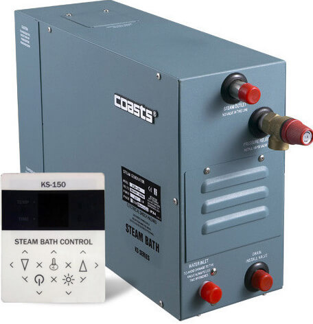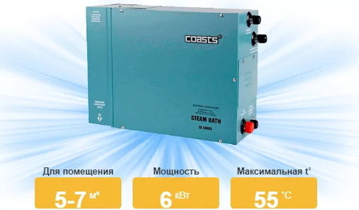 Coasts KSА-60 6 кВт 380В парогенератор для сауни / хамам з виносним пультом KS-150 для використання в лазнях і хамам (турецької лазні). Coasts KSА-60 6 кВт 380В парогенератор з виносним пультом KS-150 встановлюється в технічному приміщенні в безпосередній близькості до лазні. За допомогою Coasts KSА-60 6 кВт 380В парогенератора для сауни / хамам з виносним пультом KS-150 можна отримати у вашій лазні вологе гаряче повітря з температурою до 55 С.