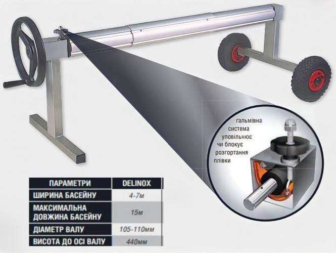 Призначений для намотування, зберігання та зручної експлуатації захисних покриттів басейну шириною від 4 до 7 м та довжиною до 15 м.