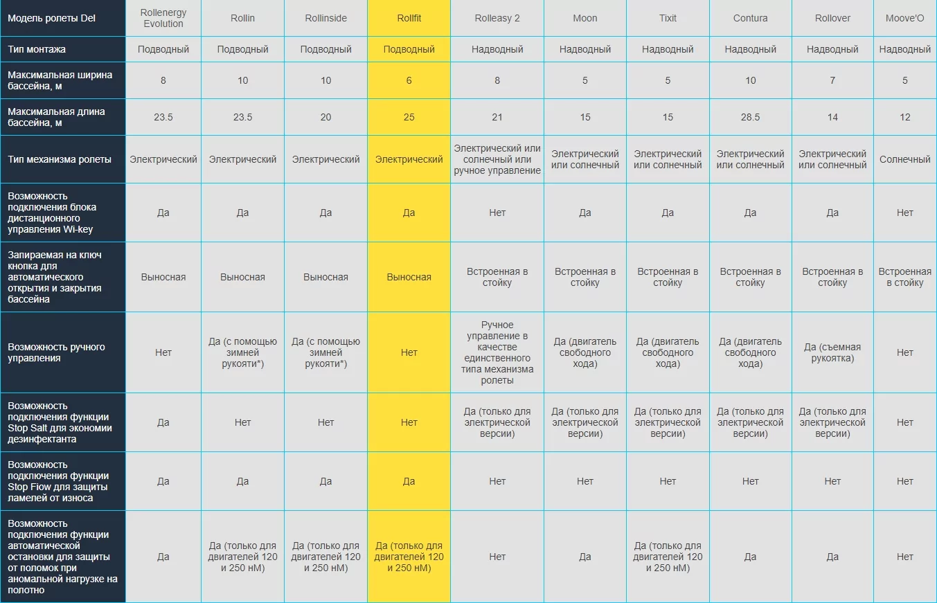 Del Rollfit - це підводний роллета, яка працює в автоматичному режимі для басейнів шириною від 2.5 до 6 метрів і довжиною від 3 до 25. За автоматичну роботу пристрою відповідає вбудований двигун разом з акумуляторами, які питаються від звичайної електромережі. Повне закриття басейну здійснюється всього за 2 хвилини. Також можливо підключити роллету до сонячній батареї. Дистанційне керування здійснюється за допомогою системи Wi-key і ключа кнопки. Завдяки замкам входять в комплект і системі автоблокування підводне полотно надійно фіксується.