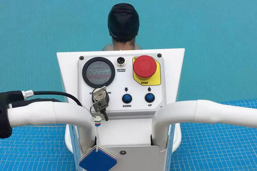 Користувач розташовується на розташоване спереду ліфта сидіння і його переміщують до краю басейну. Перебуваючи у краю басейну необхідно натиснути на пульті управління кнопку «вниз», і плавець буде повільно занурюватися в воду басейну. Для підняття сидіння, потрібно просто натиснути кнопку «вгору». Операція завершена, як тільки сидіння повернеться в початкове положення.