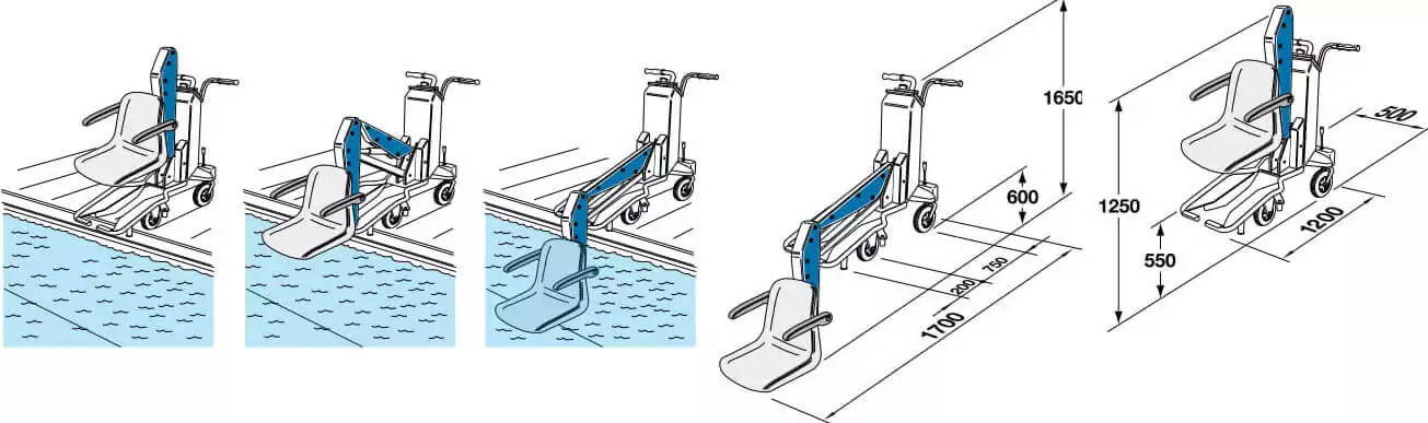 Швидкий не вимагає ніякого підлогового кріплення і простий в застосуванні. Дозволяє зручно влаштуватися людині на сидінні, після наближення до краю басейну зупиняється за допомогою спеціального важеля (в іншому випадку пристрій не працює) і опускає в воду сидить користувача при натисканні кнопки опускання.