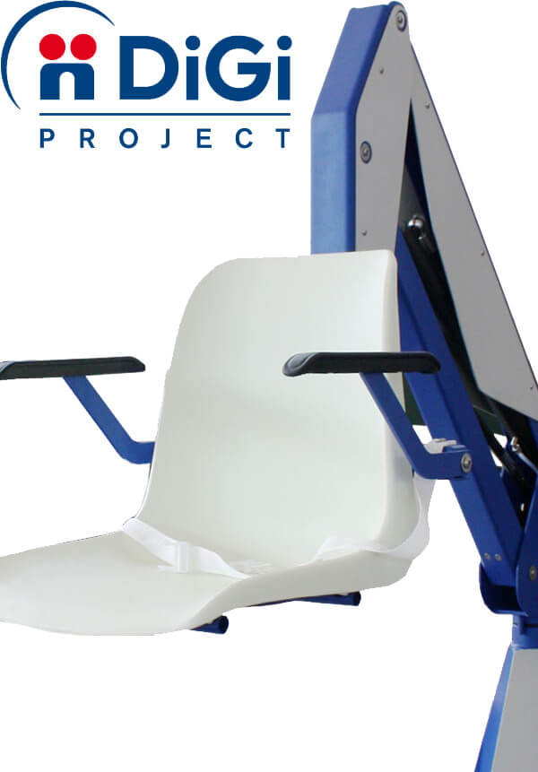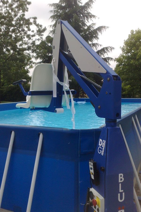 Digi Project F100 підйомник для людей з обмеженими здібностями є фіксований підйомник, який за рахунок своєї міцної і обертається конструкції дозволяє увійти людині з обмеженими можливостями в воду басейну, в яких є підноситься над підлогою виступ з полотна, пластика і дерева, наприклад, підходить для збірних щитових і каркасних басейнів. Країна виробник - Італія.