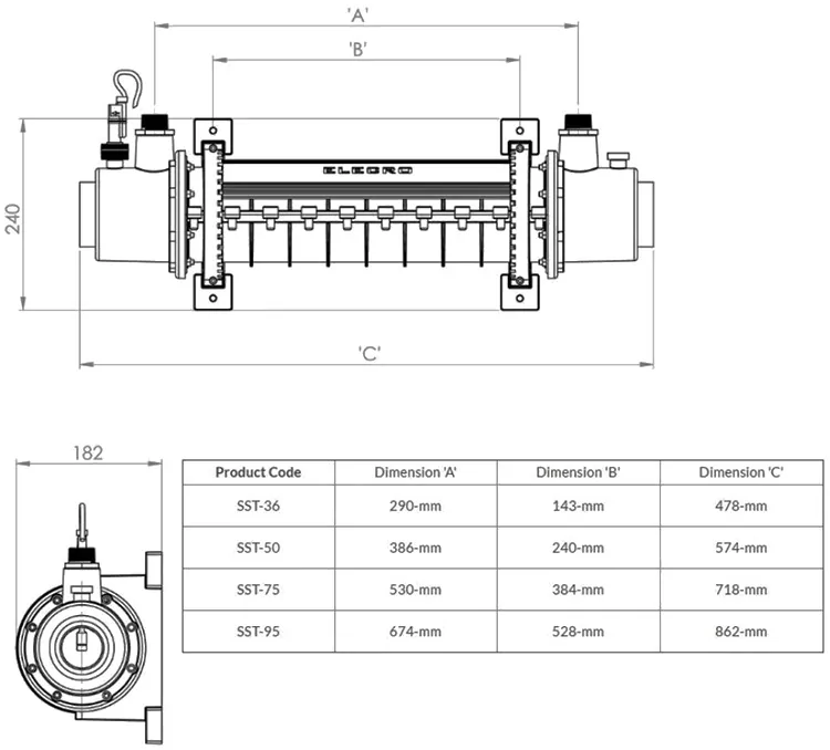 Комплект поставки включає розбірні ПВХ муфти (50–63 мм) для підключення до трубопроводу системи циркуляції басейну. Стандартні кріпильні кронштейни підходять як для підлогового та для настінного кріплення. Модельний ряд SST виробляється на заводі Elecro Engineering,
