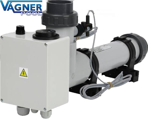 Електричний нагрівач для басейну від чеського виробника Vagner. Вбудований механічний термостат дозволяє регулювати температуру нагрівання води в діапазоні від +1С до +40С. Проточна частина корпусу виготовлена ​​із високоякісного титану. Електричний тен вироблений так само з титану, стійкого до хімічних реагентів дезінфекції басейну та солоної чи морської води.