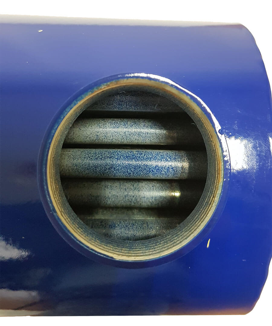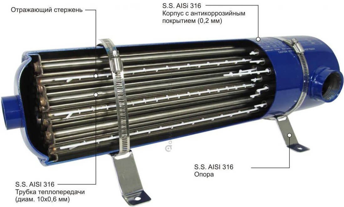 Висока ефективність теплопередачі досягається шляхом збільшення площі трубок зі сталі, що знаходяться в корпусі обладнання. Вода проходить через труби первинного корпусу, де стикається зі стрижнями, виготовленими у вигляді спіралі. Ці стрижні спрямовують воду у потрібному напрямку, одночасно утворюючи вихори. Чудові показники теплообміну досягаються завдяки постійної циркуляції води всередині конструкції.
