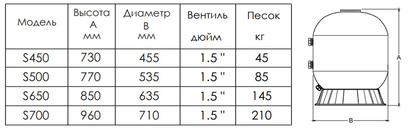 Пісочний фільтр із бічним підключенням для механічної фільтрації води в басейні об'ємом до 85 м3. Фільтраційна ємність виготовлена з полімерного пластику та посилена мотанним скловолокном. Поверхня фільтра покрита лаком для захисту від УФ та вологи, пристрій може експлуатуватися просто неба.