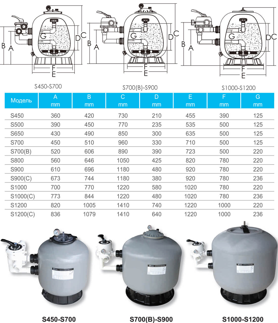 Бічне розташування клапана дозволяє монтувати пристрій у приміщеннях з обмеженою висотою. У комплект поставки включення платформа для підлоги, 6-позиційний клапан, манометр і розбірні муфти для підключення до трубопроводу. У нижній частині фільтрувальної ємності встановлена зливна горловина для зручного осушення засипки перед її заміною або для підготовки фільтра до консервації.