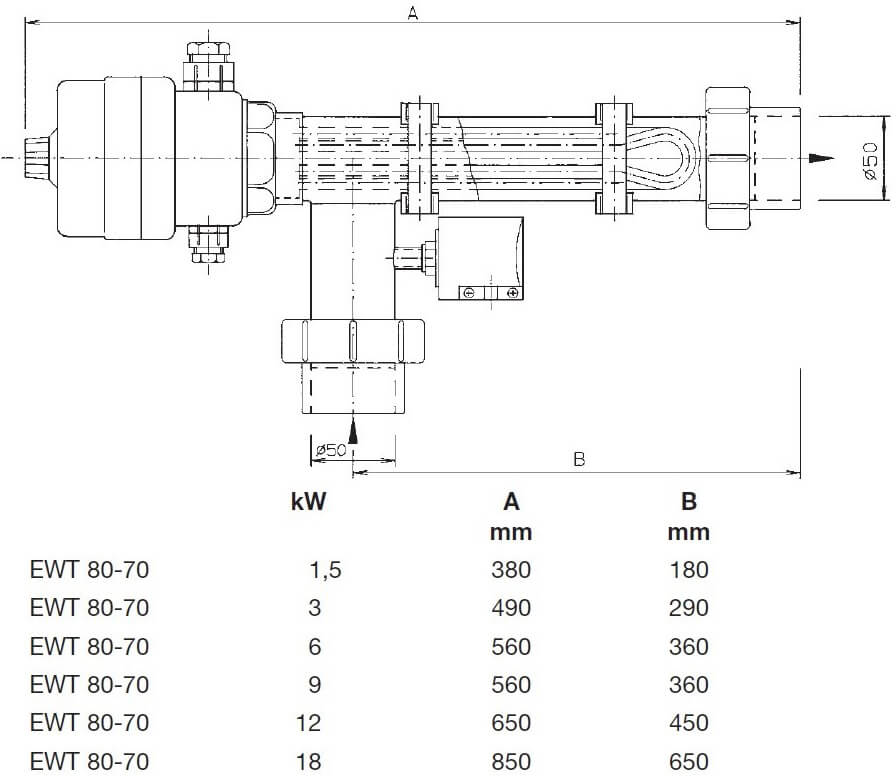 Бренд: Behncke,Тип нагрівача: нагрівач для басейнів із прісною водою,Призначення: Для СПА та невеликих басейнів,Матеріал нагрівального елемента: Сплав Incoloy,Кількість фаз: 380/400 В,Потужність, кВт: 6 Категорія: Behncke EWT 80-70 / 9 на 9,0 кВт / 380В електронагрівач для басейнів