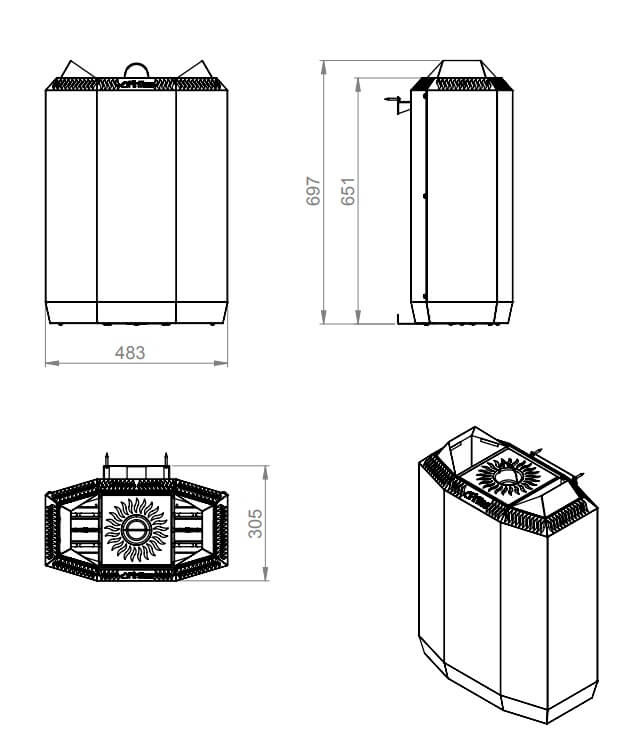 FinTec Kaisa поставляється у вигляді настінної кам'янки з кронштейном, але її можна перетворити в стоячу кам'янку, придбавши ніжки з нержавіючої стали. Мінімальна відстань від кам'янки до стіни - всього 5 см.