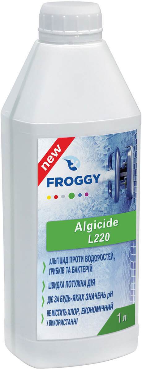 Бренд: Froggy,Тара, кг/л: 1,Засіб для чищення басейну: рідина Категорія: Froggy L220 непінний альгіцид для басейну, 1л