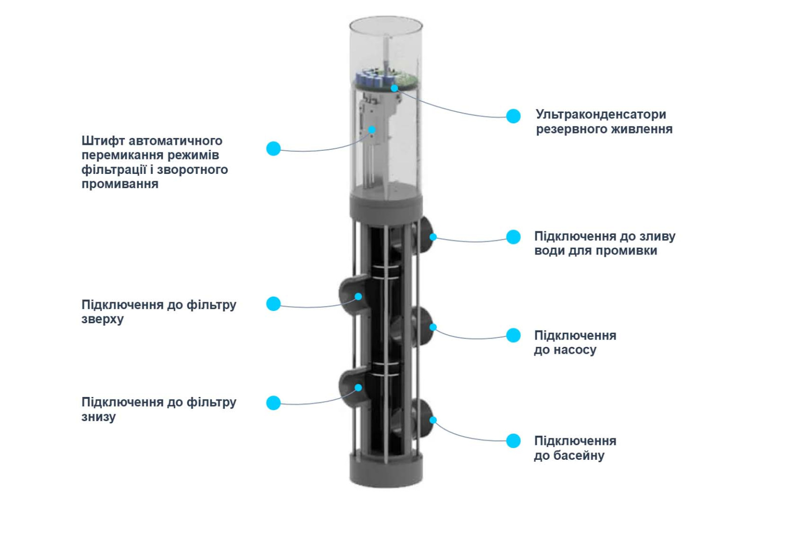 5-ти ходовий автоматичний клапан можна підключати за допомогою таймера і за допомогою будь-якого smart пристрою. Завдяки цьому користувач може здійснювати управління фільтром для басейну автоматично, користуючись смартфоном або через Wi-Fi.