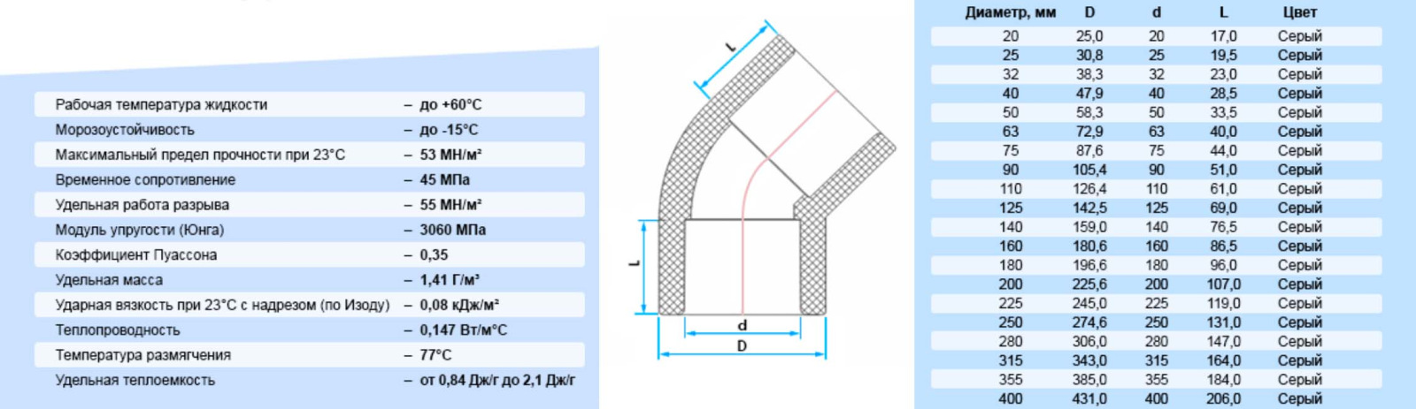 45° — це кут повороту, тобто фітинг повертає трубу на 45 градусів.