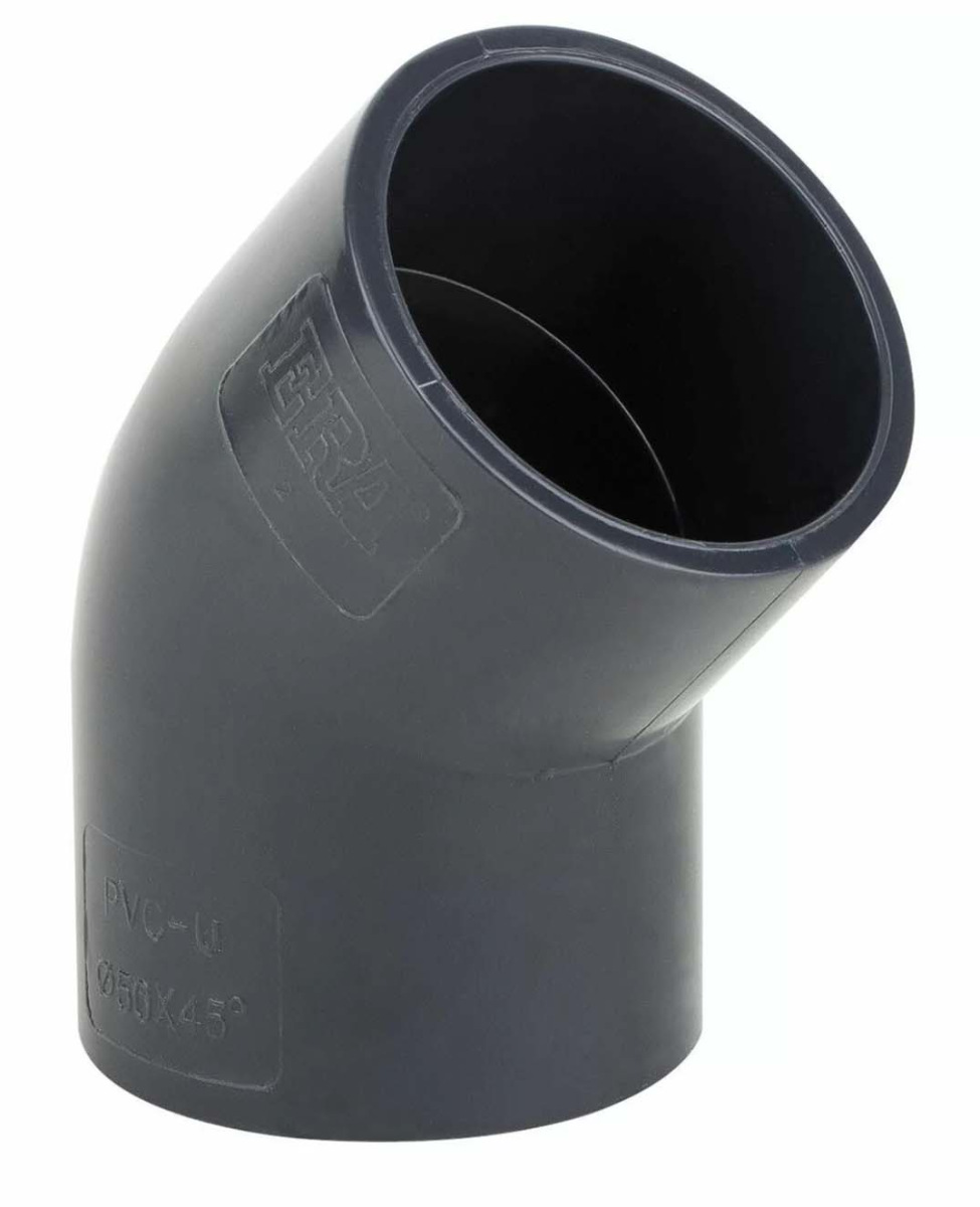 Коліно ПВХ Era 45 — це трубний фітинг (пластикове коліно з полівінілхлориду), що використовується для зміни напрямку трубопроводу під кутом 45°.