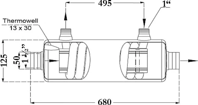 Теплообмінник має нержавіючий корпус, усередині якого розташований нагрівальний елемент у вигляді спіралі. Вода з басейну завдяки насосу системи фільтрації надходить у теплообмінник. Завдяки контакту води зі спіраллю теплова енергія теплоносія передається воді басейну - вода у басейні нагрівається.