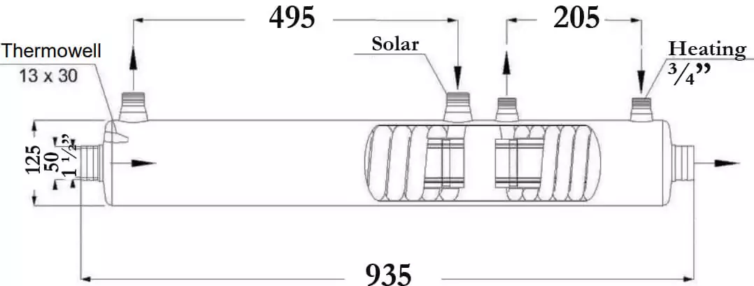 Спіральний теплообмінник комбінованого типу для системи нагрівання води та підтримки заданої температури в басейнах одночасно за допомогою опалювальних котлів та сонячних колекторів або теплових насосів опалення.