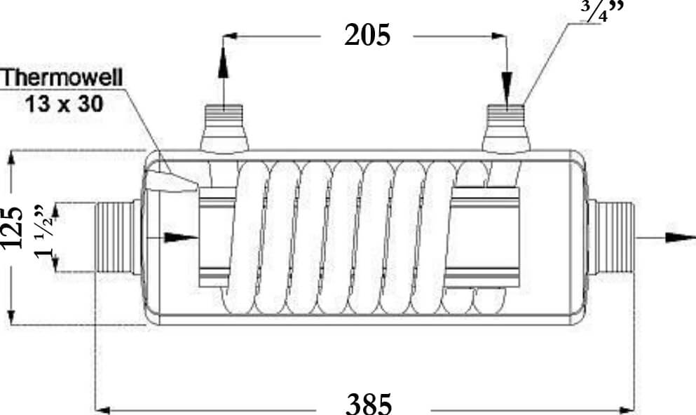 Спіральний теплообмінник у нержавіючому корпусі для системи нагрівання води та підтримки заданої температури в басейнах за допомогою опалювальних котлів, сонячних колекторів, теплових насосів опалення.