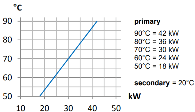 Потужність теплообмінника при 90° - 42 кВт. Потужність теплообмінника при 60° - 24 кВт.