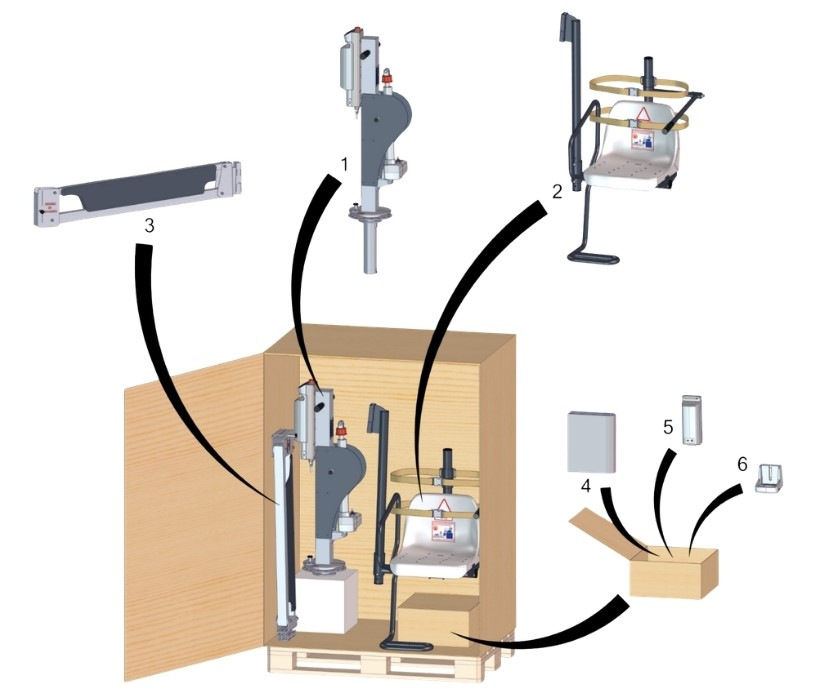 Комплектація: підйомний пристрій METALU 3200, опорна вертикальна стійка (монтажний елемент), електронний модуль управління, пульт дистанційного контролю роботи, комплект акумуляторних батарей (2 шт.), зарядний мережевий пристрій, ергономічне знімне сидіння, підтримуючий підлокітник, керівництво користувача, документи гарантій.