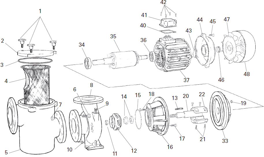 Префільтр збільшеного розміру кріпиться до моторного блоку надійним фланцевим з'єднанням. Кошик грубого очищення виготовлений з нержавіючої сталі AISI-316. Кришка кошика чавунна, фіксується трьома гвинтами, з ручною насадкою. Для зняття кришки не потрібний інструмент.