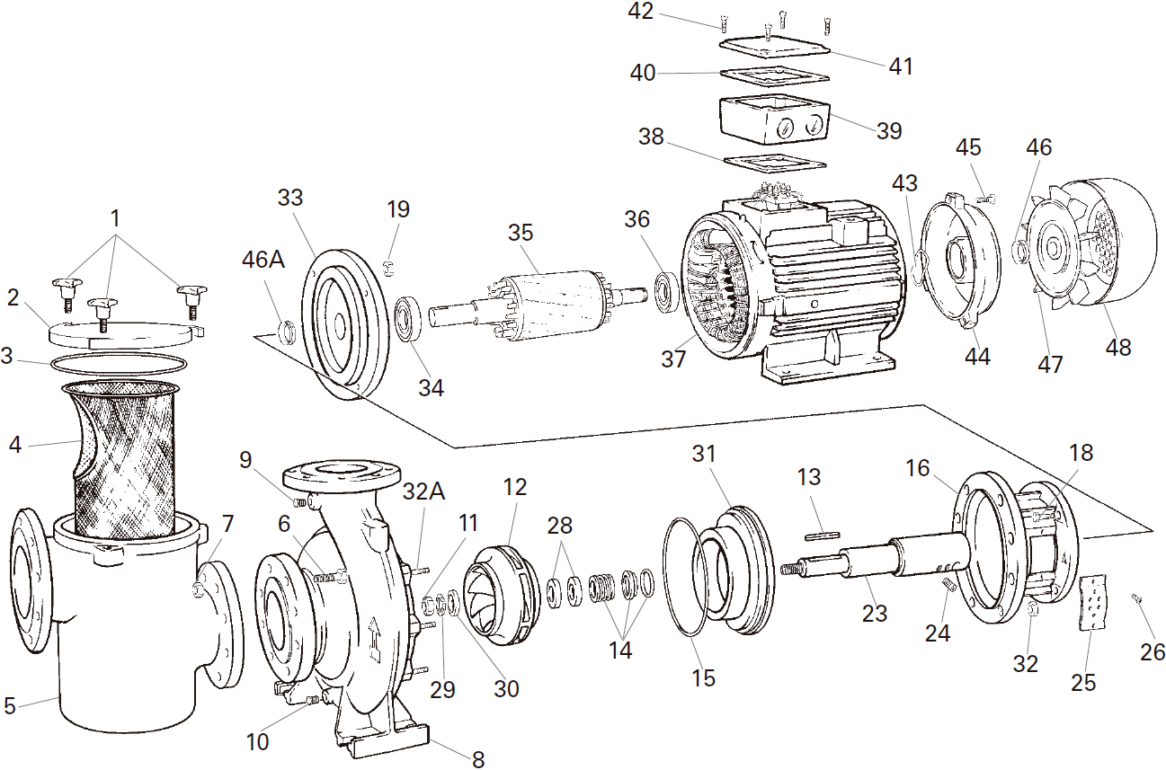 Префільтр збільшеного розміру кріпиться до моторного блоку надійним фланцевим з'єднанням. Кошик грубого очищення виготовлений з нержавіючої сталі AISI-316. Кришка кошика чавунна, фіксується трьома гвинтами, з ручною насадкою. Для зняття кришки не потрібний інструмент.