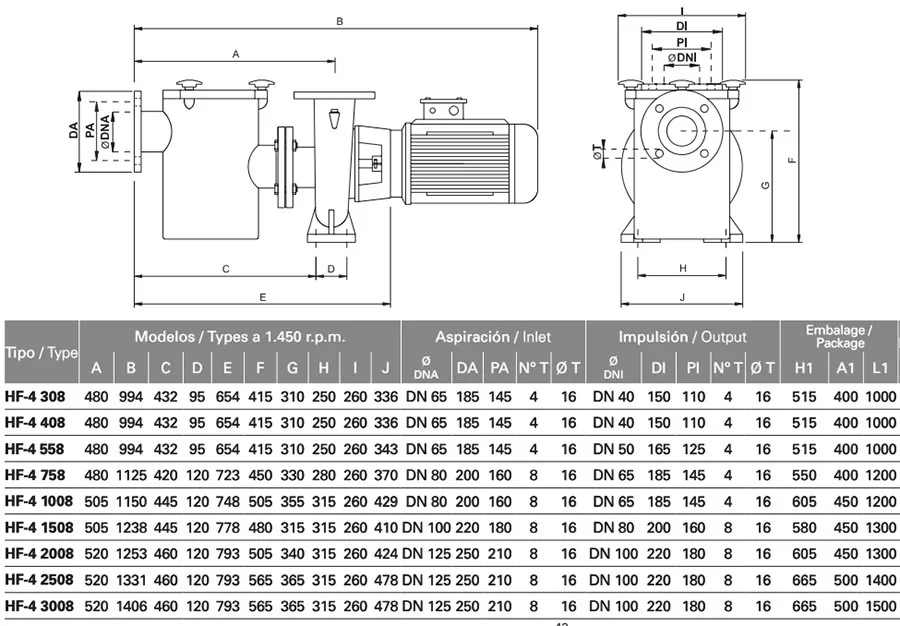 Бренд: AQUAVIVA,Продуктивність, м3/год: 33,Потужність, кВт: 3,Призначення насоса: Самовсмоктуючий насос з префільтром Категорія: Saci HF - 4 558 - 43 м3/год, 4 кВт, 400 В насос для басейну