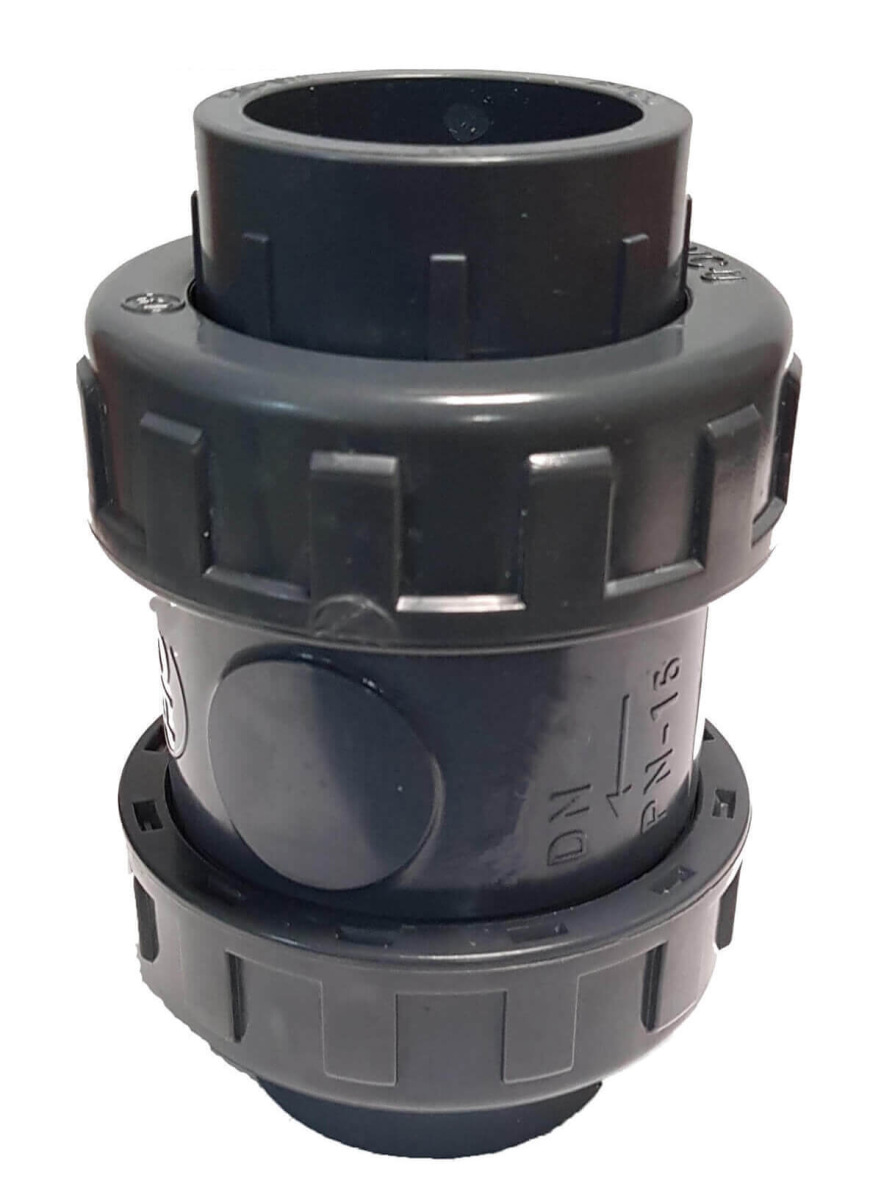 Зворотний клапан ПВХ пружинний d 40, одна з різновидів фітингів, застосовується в трубопроводах об'вязкі басейну. Матеріал заглушки ПВХ (полівінілхлорид), пружина нержавіюча сталь.