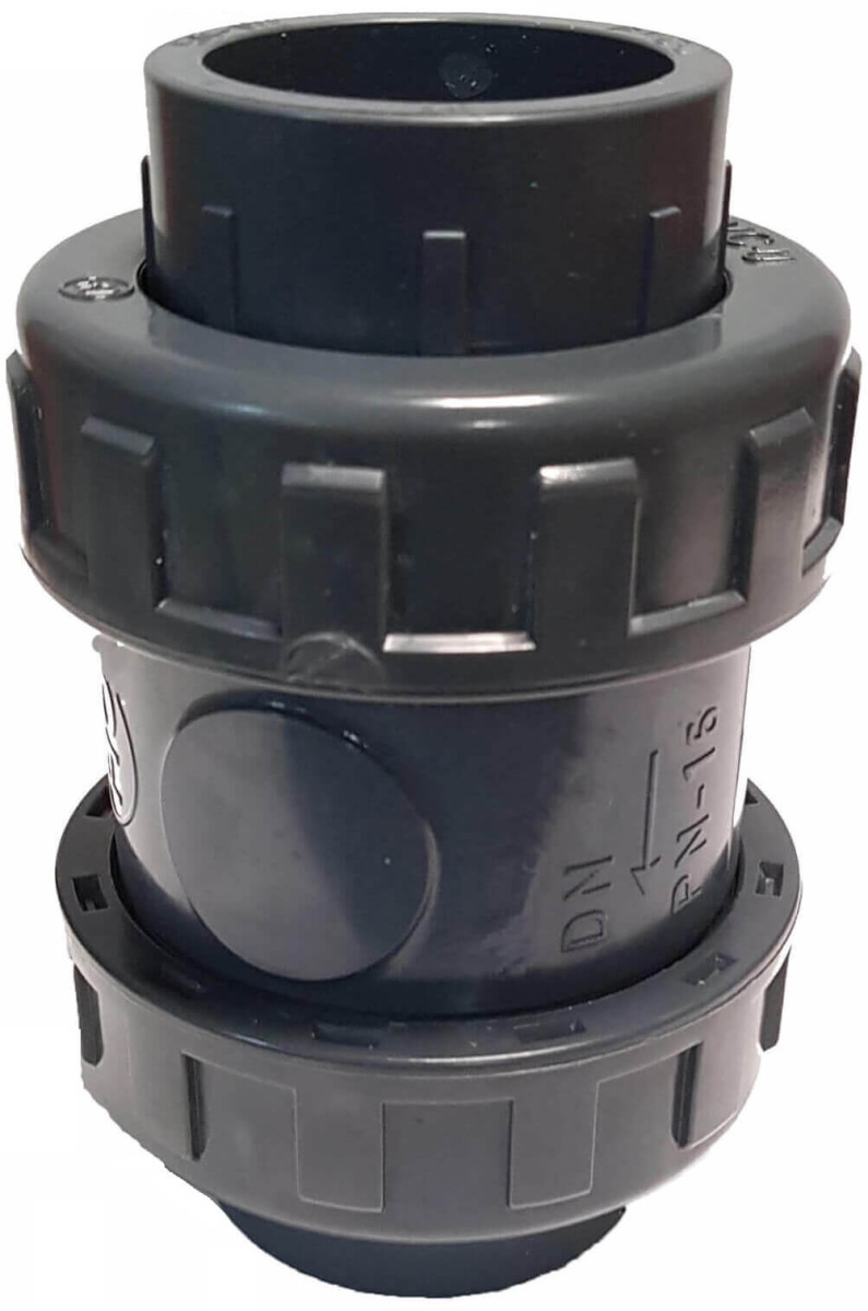 Зворотний клапан ПВХ пружинний d 90, одна з різновидів фітингів, застосовується в трубопроводах об'вязкі басейну. Матеріал заглушки ПВХ (полівінілхлорид), пружина нержавіюча сталь.