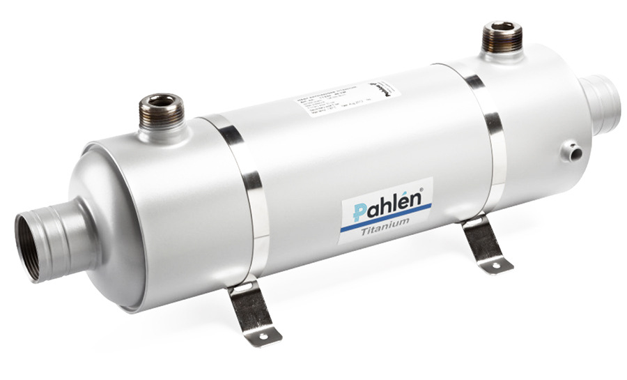 У теплообміннику передбачено захист від перегріву. Якщо температура води перевищує вказане значення на термостаті, спрацьовує автоматичне блокування подачі води в теплообмінник. Теплообмінник Pahlen Hi-Flow Titan спіральний, це дає можливість його встановлення в системах із високим тиском.