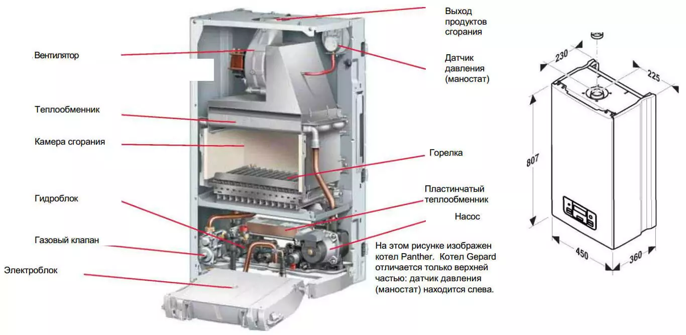Відведення продуктів згоряння здійснюється примусовим способом. Турбокотел Protherm Пантера 30 KTV служить для обігріву і підготовки води для систем ГВП. Корисна теплова потужність котлів сягає близько 30 кВт, а ККД прирівнює 92%. Головною особливістю котла є його здатність швидко і стабільно подавати гарячу воду.