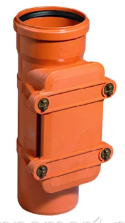 Ревізія DN125 мм Ostendorf для зовнішньої каналізації розтрубною конструкції, оснащена гумовим кільцем ущільнювача, за допомогою якого утворюється герметичне і надійне з'єднання з каналізаційною трубою або ж з будь-якими іншими зовнішніми розтрубними фітингами.