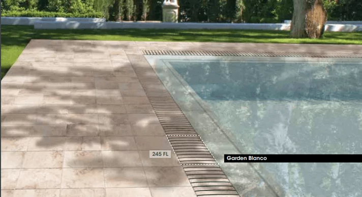 Rosa Gres 245FR 245х22 мм керамічна решітка переливу дозволяє оформити переливні лотки з радіальної геометрією. Так само важливим є і те, що текстура і колір решітки проводиться згідно існуючих колекцій керамічної плитки для басейну фабрики ROSA GRES.