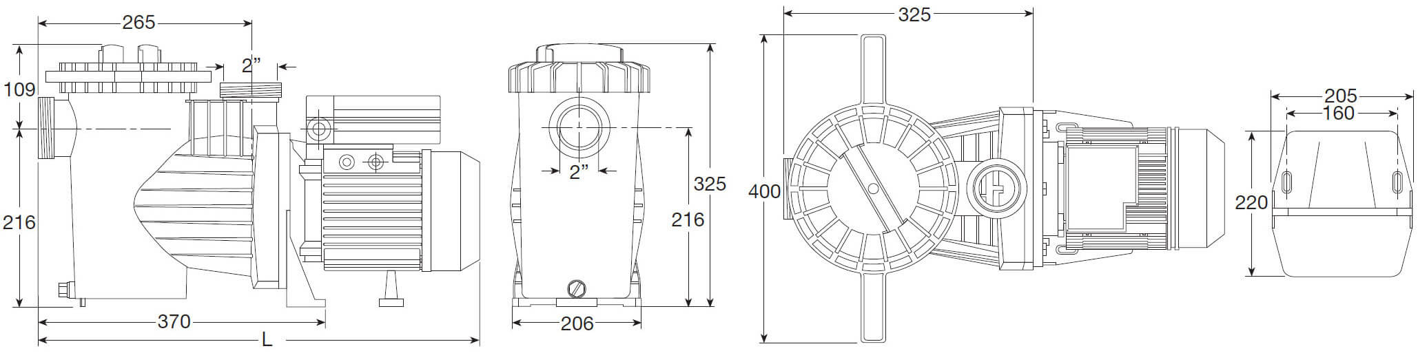 Самовсмоктувальний насос для системи фільтрації в басейнах об'ємом до 50 м3. Продуктивність складає 10 м3/год за висотою стовпа води – 8 метрів. Потужність насоса – 0,37 кВт. Країна-виробник – Іспанія.