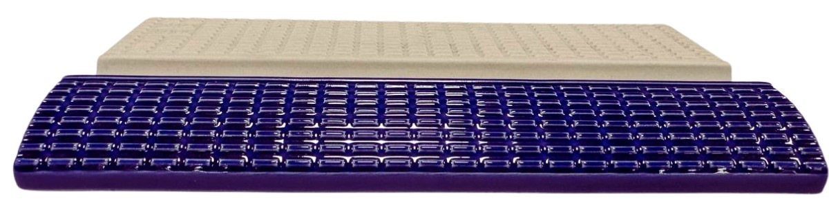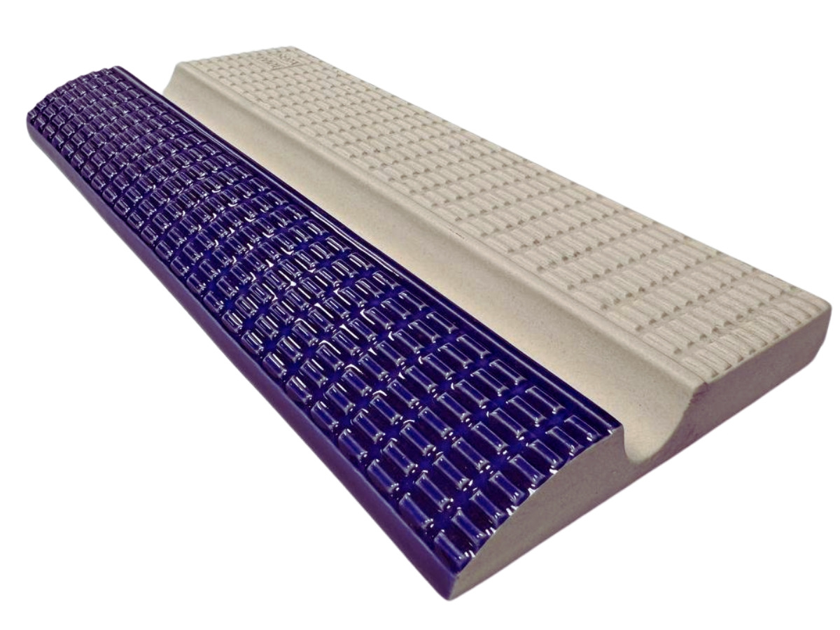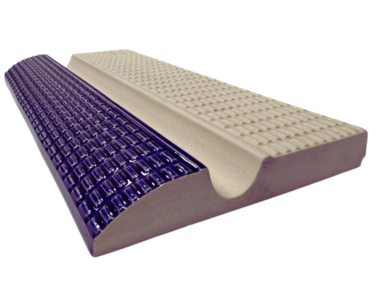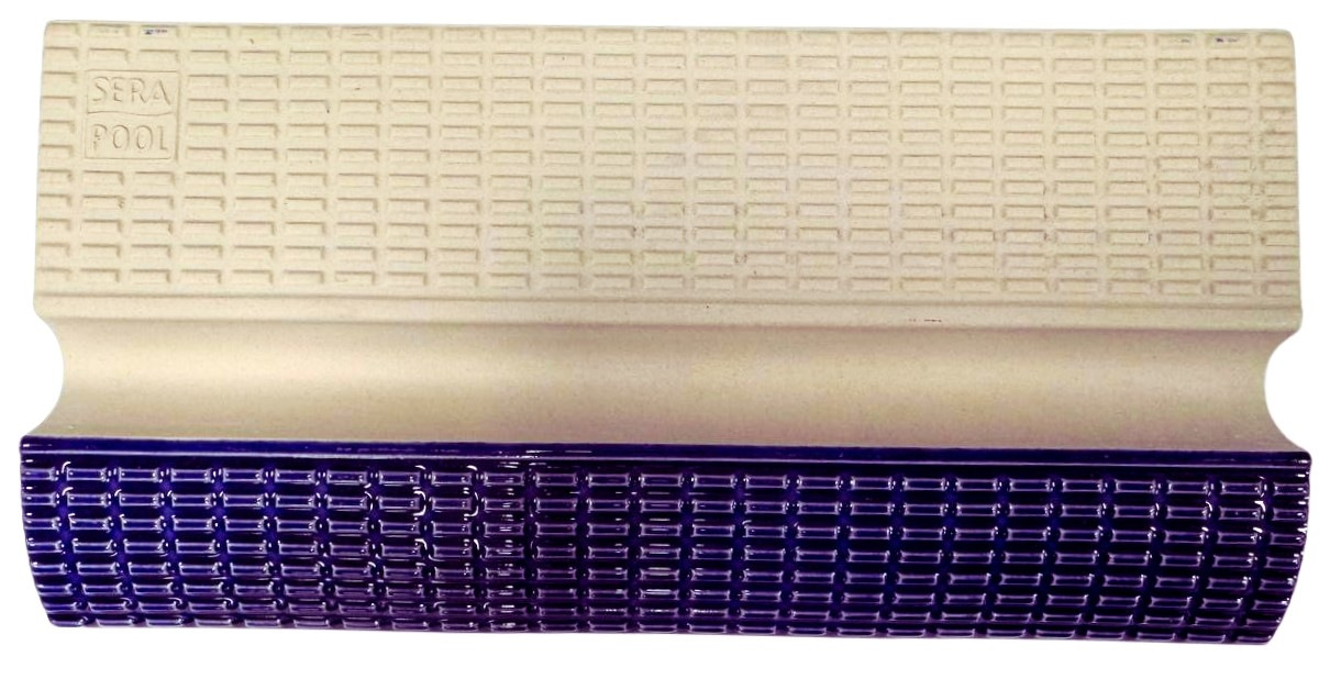 Керамічна плитка з протиковзким покриттям для облицювання бортів у спортивних та олімпійських басейнах. Жолоб у центральній частині плитки для зручного хвату рук плавця.