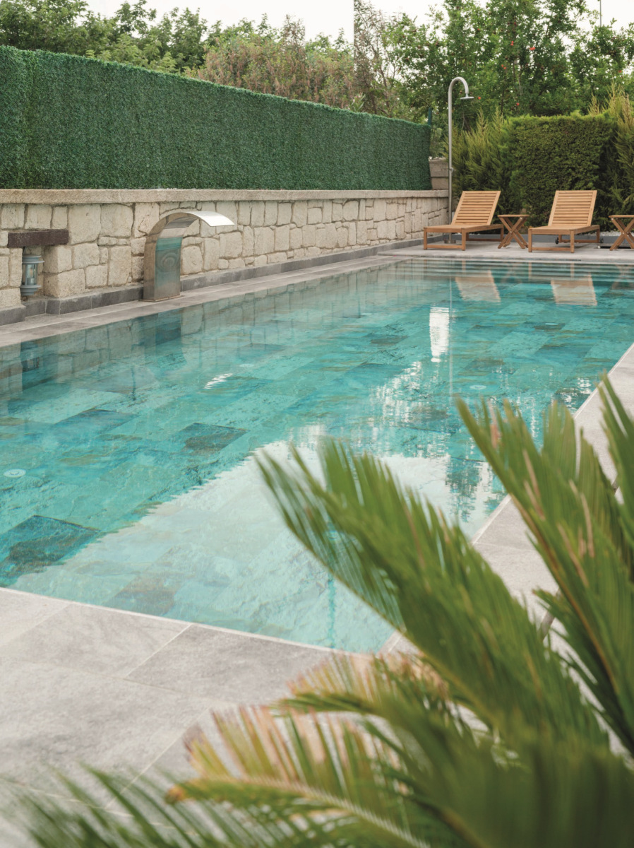 Керамогранітна плитка Serapool Relax Seaside Green надає воді в басейні спокійного зеленого відтінку з м’якими природними нюансами, натхненними гармонією природи та свіжістю морського узбережжя. Цей відтінок чудово підкреслює глибину басейну та, у поєднанні з навколишньою рослинністю, створює відчуття затишку й умиротворення. Залежно від освітлення вода може переливатися від світло-зеленого до більш насиченого зеленого, м’яко інтегруючись у інтер’єр або ландшафт.
