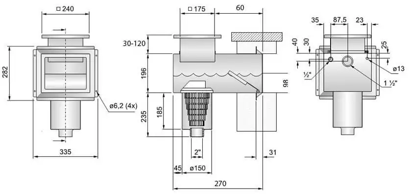 Аналог скімера Pahlen з короткою горловиною з нержавіючої сталі під бетон 112972, але з виходами для доливання, переливу та кабелю датчика рівня.