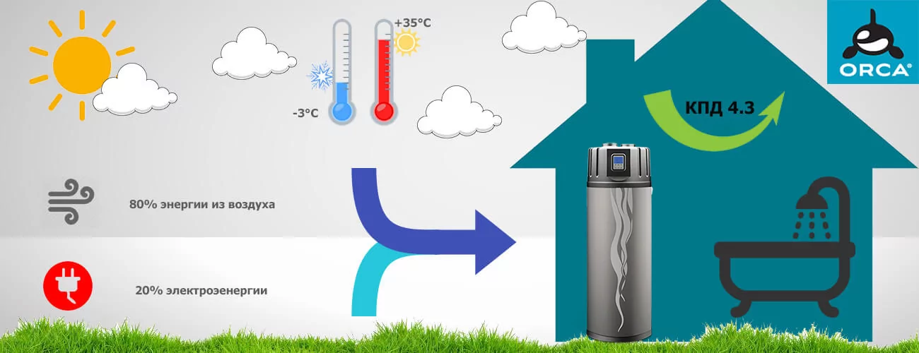 Ефективно зігріти воду для побутових потреб тепловий насос Orca Zeus здатний при температурах від -3 і до +35 С.