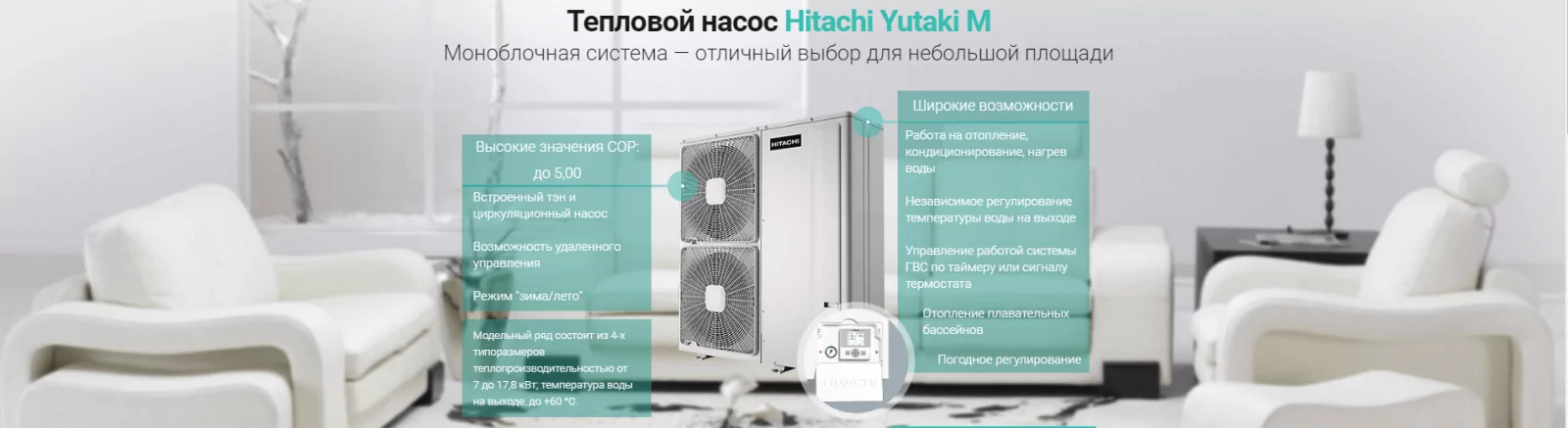 Моноблочний тепловий насос для опалення HITACHI Yutaki M RASM-6VNE, потужністю 17,8 кВт, так само може застосовуватися і для ГВП (при установці зовнішнього накопичувального бака) або в якості кондиціонера для приміщень.