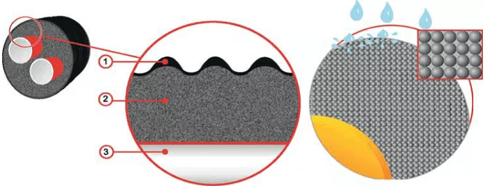 полібутеновие труба укладена в теплоізоляцію високої ефективності з спіненого фізично поліетилену Thermaflex, який так само має захист від зовнішнього впливу у вигляді високоміцного кожуха у вигляді гофрованого поліетилену низького тиску, з додаванням карбону, привареного до теплової ізоляції.