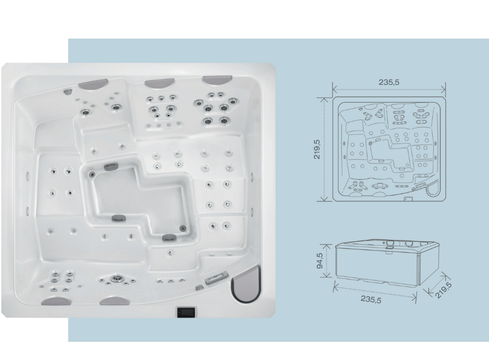 Спа-ванна оснащена продуманою системою гідромасажу та аеромасажу, що забезпечує глибоке розслаблення та відновлення. Масаж поєднує інтенсивні спрямовані струмені та м'яку обволікаючу дію, що дозволяє підібрати комфортний режим для кожного користувача. Форсунки розташовані з урахуванням анатомії тіла та впливають на основні зони:
