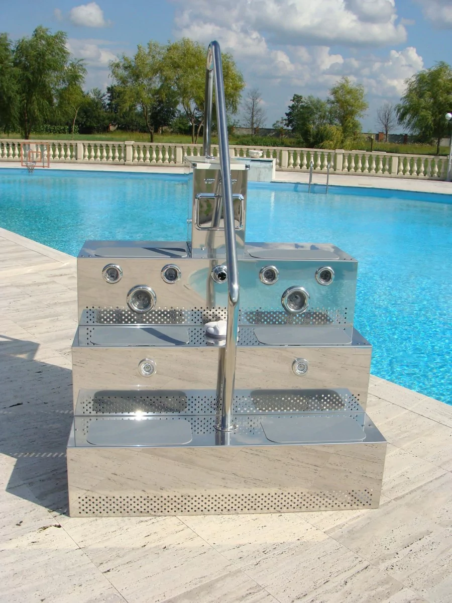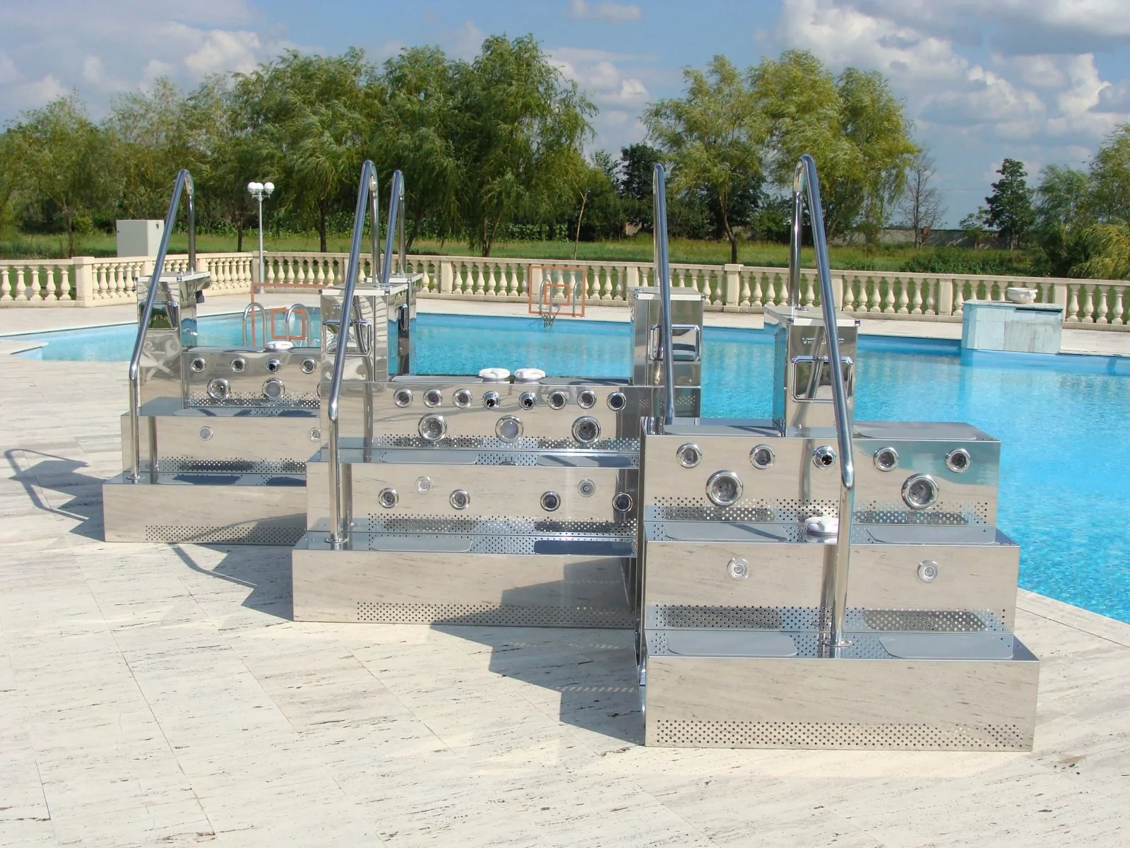 Фільтрувальні гідромасажні сходи VIP Step Piccolo з нержавіючої сталі це система фільтрації зроблена у вигляді вбудованих сходів з гідромасажем, застосовується для забезпечення системи очищення води у вашому басейні від механічних суспензій. Застосовується для басейнів об'ємом до 80 м3.