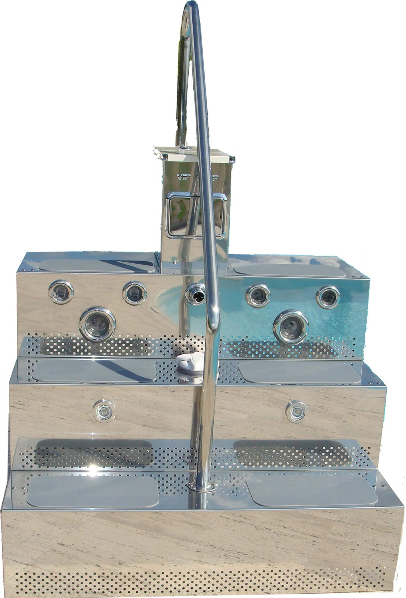 Фільтрувальні гідромасажні сходи VIP Step Piccolo з нержавіючої сталі повністю зроблена з полірованої нержавіючої сталі AISI 316, це не пластик і не поліпропілен! Придатна для застосування з морською водою. Ця система буде служити стільки, скільки буде існувати ваш басейн!