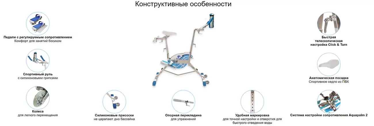 Водний велосипед можна використовувати в басейні з будь-якого матеріалу. Байк оснащується силіконовими насадками, що захищають матеріали покриття від пошкоджень. Також вони гарантують високий рівень зчеплення, тобто стійкість байка.