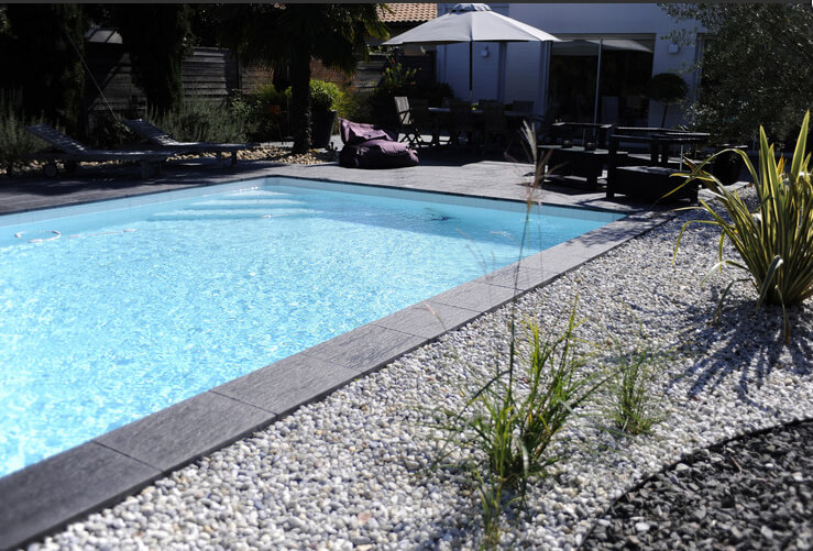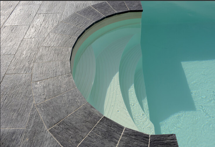 Искусственный камень, для облицовки бассейнов, производства Франция. Структура камня Ardoisiere Pierra имитирует колотый гранит. Покрыт специальным составом, защищающим камень от проникновения в него загрязнений.