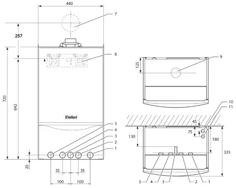 6. Кронштейн для крепления на стену 7. Проход коаксиального дымохода через стену 8. Подключение коаксиального дымохода 9. Патрубок отвода конденсата 10. Патрубок предохранительного клапана |