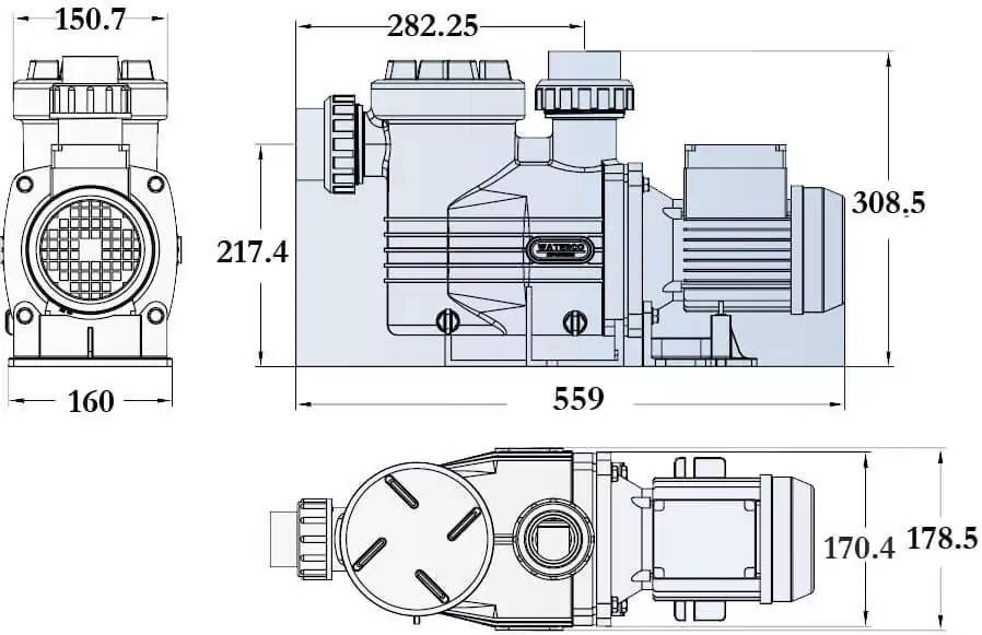 Насос моноблочного типа с префильтром для системы фильтрации бассейна объемом до 110 м3. Конструкция рабочего колеса и диффузора насоса максимизирует гидравлическую мощность насоса, минимизируя при этом турбулентность. Эффективная гидравлическая производительность насоса снижает потребление энергии, что приводит к снижению эксплуатационных расходов.