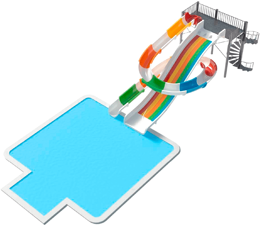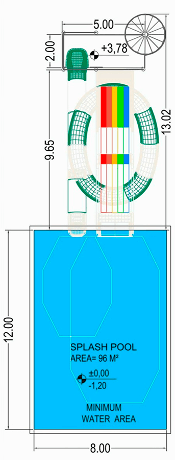 Для установки комплекса требуется площадь около 105 квадратных метров, а также приемный бассейн, что делает его идеальным решением для аквазон в отелях, курортах или пансионатах, ориентированных на активный отдых для всей семьи.